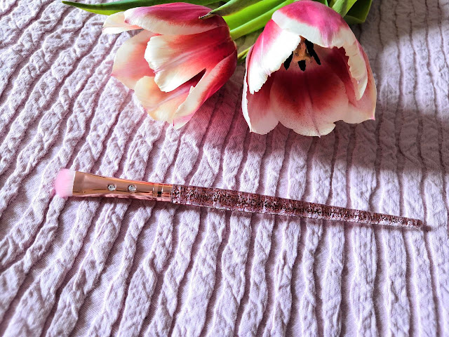 Tämä pikkuinen sivellin oli niin söpö. että se lähti yhtenä extrana mukaan ihan siitä syystä. Siveltimen varsi on täynä pientä glitteriä ja karva on vaaleanpunainen. Koko komeuden kruunaa siveltimen päässä olevat kaksi pientä timanttia. Harjaosa on tässä aika jämäkkä, joten uskon tämän sopivan parhaiten luomivärin pakkaamiseen luomelle.