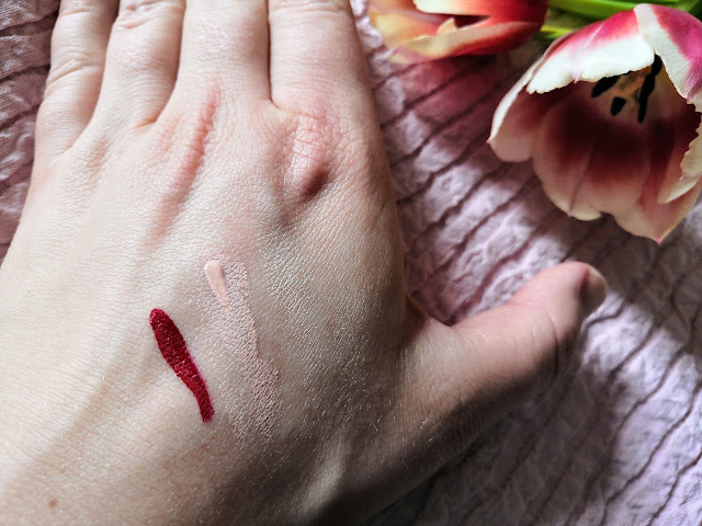 Tämä nestemäinen mattapuna on aivan ihanan värinen kirkkaan punainen. Pakkaus on myös söpö ja hylsyn korkki on kaunis glitterinen. Sopii mulle, kun pidän kaikesta kimaltelevasta 😃 Huulipuna on todella mattainen ja pysyy huulilla täydellisesti. Kädessä olevaa swatchiakin sain hinkata hetken ja edelleen on himmeä jälki kämmenselällä. Kiva keväinen ja raikas väri.