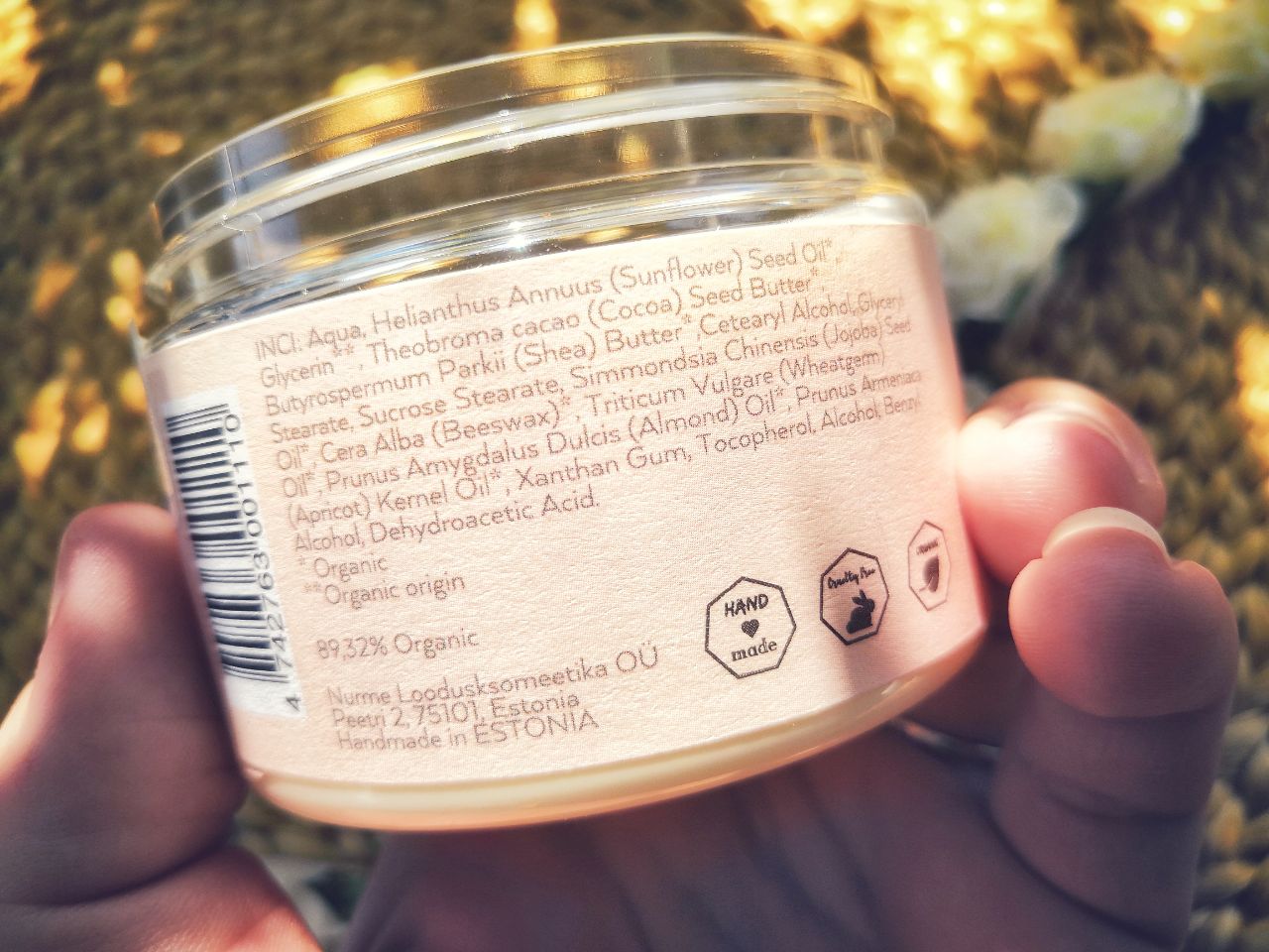 Tämä täysin luomu mantelivartalovoide oli kuitenkin kaikessa yksinkertaisuudessaan hyvin helppo ja miellyttävä levittää, joten jopa minä olen kaikkien niskoittelujen jälkeen ihan mielellään tarttunut tähän purkkiin iltaisin ja levitellyt kiltisti hyvän kerroksen rasvaa muuallekin kuin naamatauluuni. Tykkään erityisesti tämän nopeasta imeytymisestä ihoon ja siitä ettei rasva jätä mitään lähmäisyyden tunnetta. Tuoksu on todella todella mieto manteli eikä sitä oikeastaan edes haista, ellei nenää työnnä lähes purkin sisään. Tämä sopii siis erinomaisesti hajusteherkille. Rasvassa on ihanan kermainen koostumus, joka tekee myös ihosta samettisen pehmeän ilman silikoniyhdisteitä.