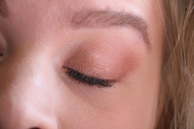 Näissä kuvissa näette swatchit kaikista väreistä. Pigmentti oli huikean hyvä ja koostumus kermaisen pehmeä. Karisemista ei juurikaan tapahdu ja kokonaisuutena paletti on ihan kympin arvoinen. Sävyt sopivat oikein hyvin yhteen keskenään ja vaikka ne näyttävätkin hyvin maltillisen maanläheisiltä, saa paletilla myös vähän räväkempää meikkiä ja tummuuttaa voi aina lisätä kerrostelemalla. Tein tällä malliksi yhden meikin, josta kuvat alla. Meikissä käytin paletin kolmea eri ruskean ja ruusukullan sävyjä. Alaripsien tyveen lisäsin myös paletin tummanpunaiselta näyttävää sävyä, joka olikin punaiseen taittava ruskea. Valitettavasti kuvaan asti ei välity niin tarkasti sävyt ja niiden upea hohto, mutta luonnossa nämä ovat varsin upeita! Tässä paletissa onkin täydellisiä syksyisiä sävyjä ja sopivia yhdistelmiä arkimeikkiin.