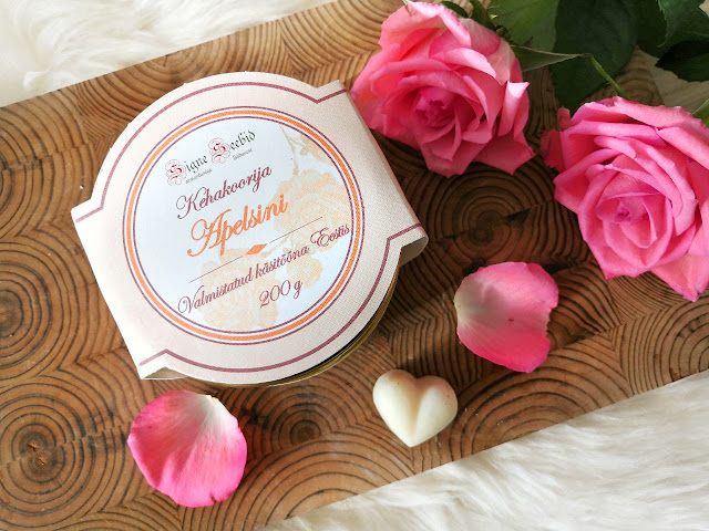 Huumaava appelsiinin tuoksu leijailee nenään, kun avaan lasipurkin kannen ja hetken aikaa voi kuvitella olevansa suuressa hedelmätarhassa. Aivan ihana tuoksu vangitsee aistit ja tekee kuorinnasta rauhoittavan kokemuksen. Vartalokuorinnassa on käytetty karkeaa sokeria, jota hieroessa syntyy mekaaninen kuorinta. Kuorinta poistaa iholta kuolleen solukon ja epäpuhtaudet, saaden sen sädentimään raikkaana ja pehmeänä. Tuotteessa on käytetty E-vitamiinia ja herukkasiemenöljyä glyseriinin ja appelsiinin eteerisen öljyn lisäksi. Tässä kuorinnassa on tarpeeksi jytyä, sillä itse pidän vartalokuorinnoissa siitä, että rakeet ovat riittävän isoja ja karkeita. Kuorinnan jälkeen iho on pehmeä ja kosteutettu.