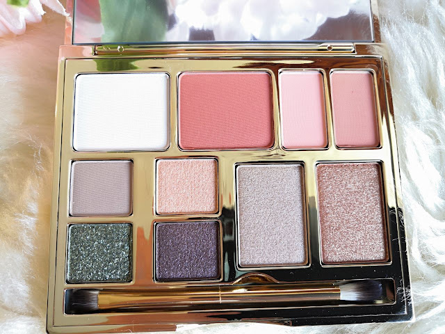 Tämä kaunis kultainen Brow bar Drama queen paletti oli oma valintani boksiin. En kuollaksenikaan muista mitä muut vaihtoehdot olivat, mutta muistaakseni ei mitään kovin kummoista, joten päädyin siksi tähän palettiin. Ja onhan tämä kaunis. Jopa paletin sivellin vaikuttaa tosi laadukkaalta ja sitä voi aivan hyvin käyttää meikin tekemiseen. Palettihan on monitoimipaletti, joka itseni yllätti täysin. Kuvauksessa nimittäin kerrotaan paletin sisältävän kaksi poskipunaa, bronzerin, translucent puuterin, 2 highlighteria sekä neljä luomiväriä. Pannut ovat kuitenkin sen verran pienet, ettei näihin mahdu mikään mun olemassa olevista kasvosiveltimistä. En ymmärrä miten tästä paletista ikipäivänä saa poskipunaa tai aurinkopuuteria otettua mitenkään järkevästi. Ei ainakaan normaaleilla kasvosilvetimillä. Näkisinkin tämän paletin ehdottomasti luomiväripalettina, jossa on kauniita mattasävyjä ja muutamia shimmerisiä sävyjä. Highlightereita voi ehkä siinä ja siinä käyttää niiden omaan käyttötarkoitukseen, mutta sävyt sopivat täydellisesti myös luomille. Kauniit ja pigmenttiset sävyt.