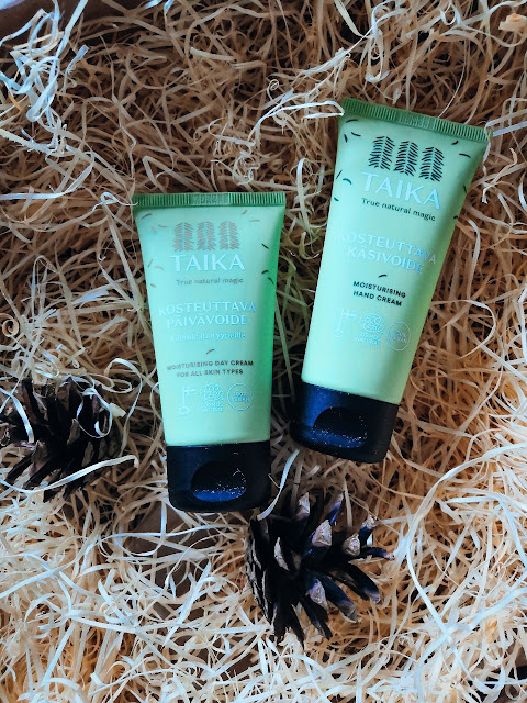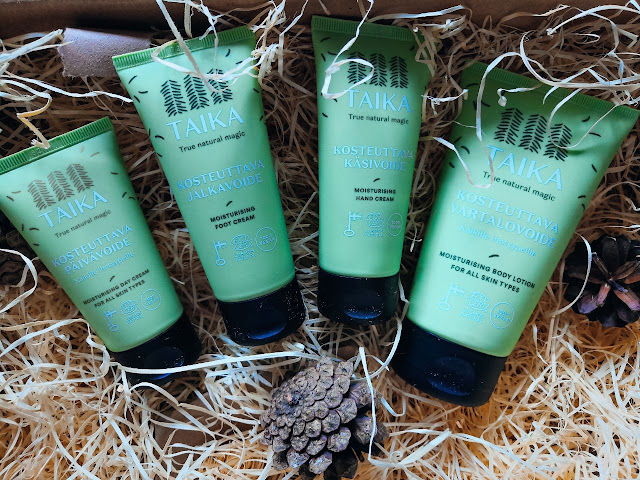 Testailin jo innosta soikeana näitä ihania uutuuksia ja yllätyin miten hyviä nämä oikeasti oli. Käsivoide imeytyi ihan samantien, kosteutti kuivat korppukädet, mutta iho ei jäänyt yhtään rasvaisen tahmeaksi. Hommia pystyi jatkamaan tietokoneella heti levityksen jälkeen, mikä on ehdottomasti käsirasvoissa mulle tärkein ominaisuus! Tuoksu on raikas, mutta mieto. Se tuo mieleen hiukan karviaisen ja mustaherkukkapensaan lehtien kirpeyden. Tuoksumaailma poikkeaakin aika lailla monista muista kosmetiikkabrändeistä, joissa tuoksut ovat voimakkaita ja selkeästi synteettisiä. Taika sarjan tuoksumaailma on hyvin luonnollinen ja siksi yllätti minut positiivisesti.