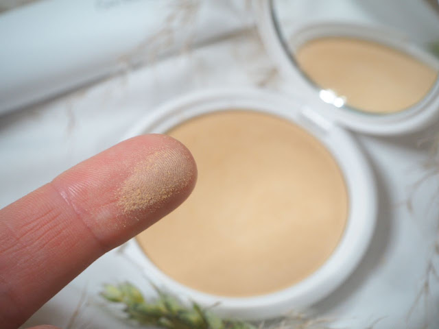 Sen kuitenkin totean jo tässä vaiheessa, ettei puuteri ole translucent (väritön) kuten lupaa. Kuten swatchistakin huomaa, on puuterin sävy kellertävä. Iholla sävy hieman vaalenee eikä tee ihosta keltaista, mutta se antaa silti iholle pigmentin. Tämä oli minusta häiritsevää, koska näin ollen tuote ei ehkä kaikille ihoväreille sovi. Huomasin myös itse meikkipohjaa kiinnittäessä, että aluksi niin kalvalla meikkivoide muuttuikin tämän puuterin töpöttelyn jälkeen omaksi "normaaliksi" ihonväriksi, koska puuteri teki siitä astetta tummemman. Sinänsä itseä ei siis haitannut liian vaalean meikkivoiteen kanssa puuterin sävy, mutta oikean sävyisen meikkivoiteen kanssa voisi meikkipohja olla astetta liian tumma.