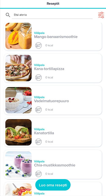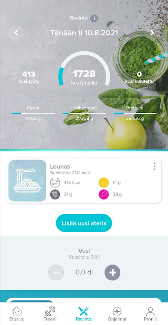Tiedän, että moni elämäntapamuutosta toteuttava haluaa pysyä tiukasti ruodussa myös ruokavalion osalta. Fitsterissä pystyy hyvin merkkaamaan kaikki päivän syödyt ateriat ja sinne lisäämään myös yksittäiset ruoka-aineet. Omia makroja (eli kaloreita ja grammamääriä) voi muokata järjestelmän vakioasetuksista. Päivän aikana jokaisen aterian jälkeen näet miten paljon olet jo syönyt ja miten paljon on vielä "varaa" syödä. Tämä on tosi hyvä ominaisuus ja tuolla sovelluksessa on ihan valtavasti niitä ruoka-aineita valmiina, joten varmasti löytyy lähes kaikki mahdollinen. Minulla on bugittanut omassa puhelimessa tuo ruokien määrien manuaalinen lisääminen, mutta olen tästä antanut palautetta ja asiaa ilmeisesti korjataan. Muuten sovellus on kyllä toiminut moitteetta.