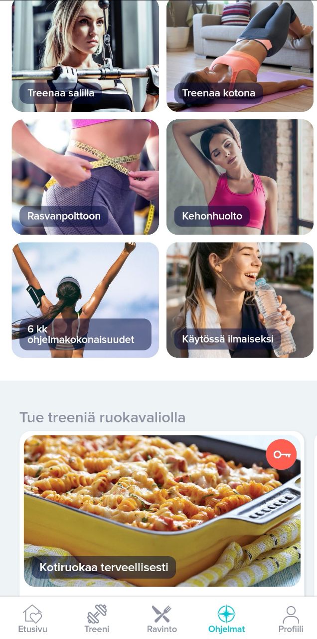 Sovelluksesta löytyy paljon erilaisia treeniohjelmia eri tavoitteisiin ja erilaisiin treenitaustoihin. On rankempia bikinivalmennuksia ja aloittelijoille sopivia kotitreenejä. Lisäksi kaikissa treeneissä on selkeät videot jokaisesta liikkeestä, joten pääset aina katsomaan miten liikkeet tehdään oikein. Näin taustasta riippumatta jokaisella on mahdollisuus lähteä mukaan hyvin matalalla kynnyksellä. Sovelluksessa on myös runsaasti reseptejä ja treenejä tukevia ruokavalioita, joten tässä on kyllä mietitty kaikki mahdollinen mitä innokkaaseen treenisyksyysi tarvitset. Lisäksi kun ostat jäsenyyden, saat käyttöösi tietyn määrän avauksia, joilla voit siis avata käyttöösi sekä treeniohjelmia että ruokavalioita. Ne on sinulla käytössä aina, kun jäsenyytesi on aktiivinen. Ostetut ohjelmat eivät siis katoa mihinkään, mikä on mahtava juttu sekin!