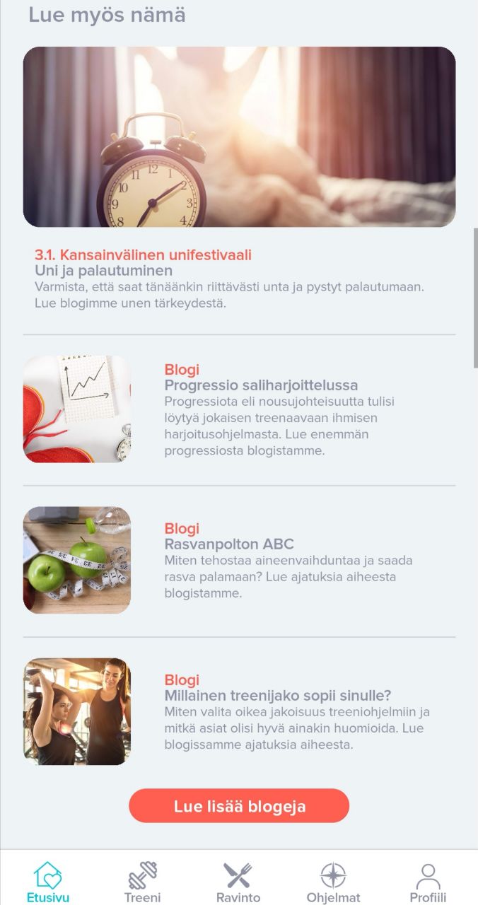 Innokkaille on sovelluksessa lisälukemista blogitekstien muodossa, joten sieltä saa eri aihepiireihin syvennettyä tietoa vielä enemmän. Täysin aloittelijallekin oikein hyödyllinen osio, sillä jos ei ole mitään hajua mitä ruokavaliot, uni ja lepo sekä treenin kuorma käytännössä tarkoittavat, niin tuolta saat kyllä tietoa ihan kaikesta. Oma kokemukseni on positiivinen vaikkakin vielä jotain bugeja sovelluksessa on. En antaisi tämän kuitenkaan häiritä, koska sovellus on vasta lanseerattu ja se kehittyy asiakaspalautteen perusteella koko ajan.